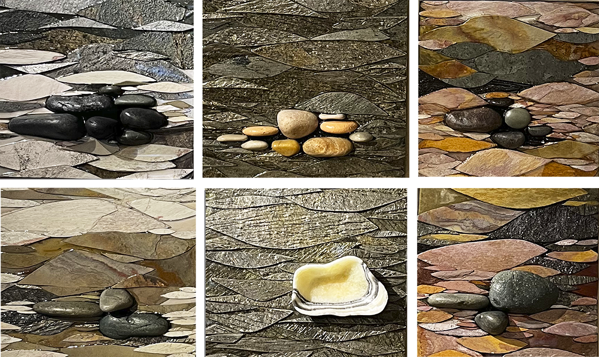 Six samples of the stone and nature collages by Erika Bushee. Let us know which ones are your favorites. Pictured are 12” x 12” panels to purchase separately or design your own wall.